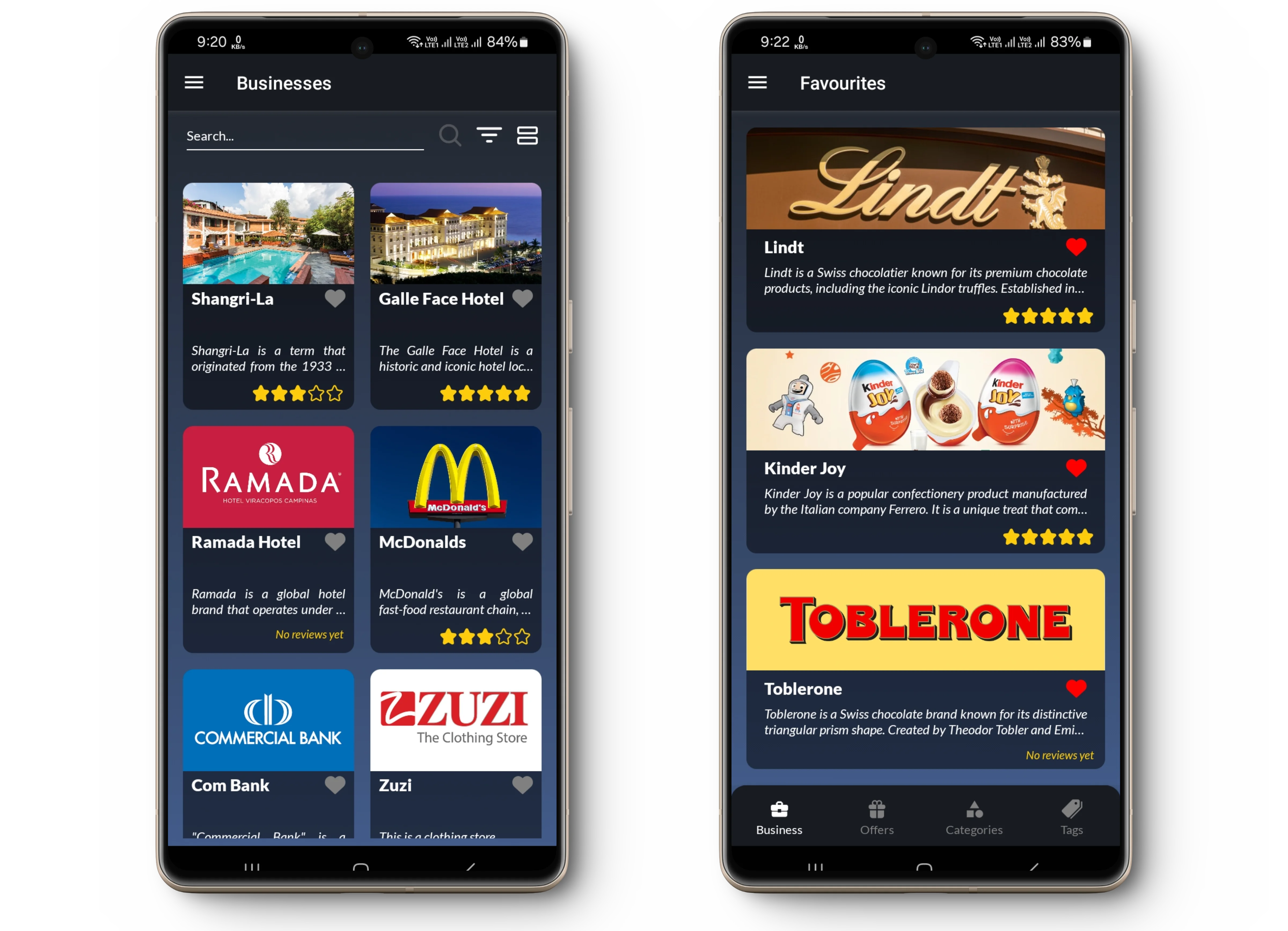 This mobile app is a business directory app which allows user to explore businesses and their offers based on preference. Allows the user to bookmark business pages and offers. Users can customize the categories of businesses they're interested in. Businesses can trigger push notifications for their offers to interested users.